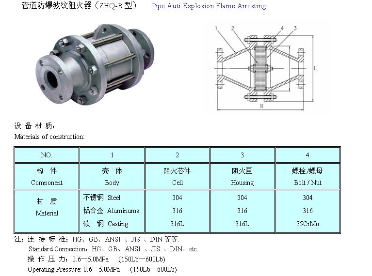 阻火器能夠阻止火焰繼續傳播并迫使火焰熄滅的因素之一是傳熱作用。我們知道,阻火器是由許多細小通道或孔隙組成的,當火焰進入這些細小通道后就形成許多細小的火焰流。由于通道或孔隙的傳熱面積很大,火焰通過通道壁進行熱交換后,溫度下降,到一定程度時火焰即被熄滅。進行的試驗表明,當把阻火器材料的導熱性提高460倍時,其熄滅直徑僅改變2.6%。這說明材質問題是次要的。即傳熱作用是熄滅火焰的一種原因,但不是主要的原因。因此,對于作為阻爆用阻火器來說,其材質的選擇不是太重要的。但是在選用材質時應考慮其機械強度和耐腐蝕等性能。