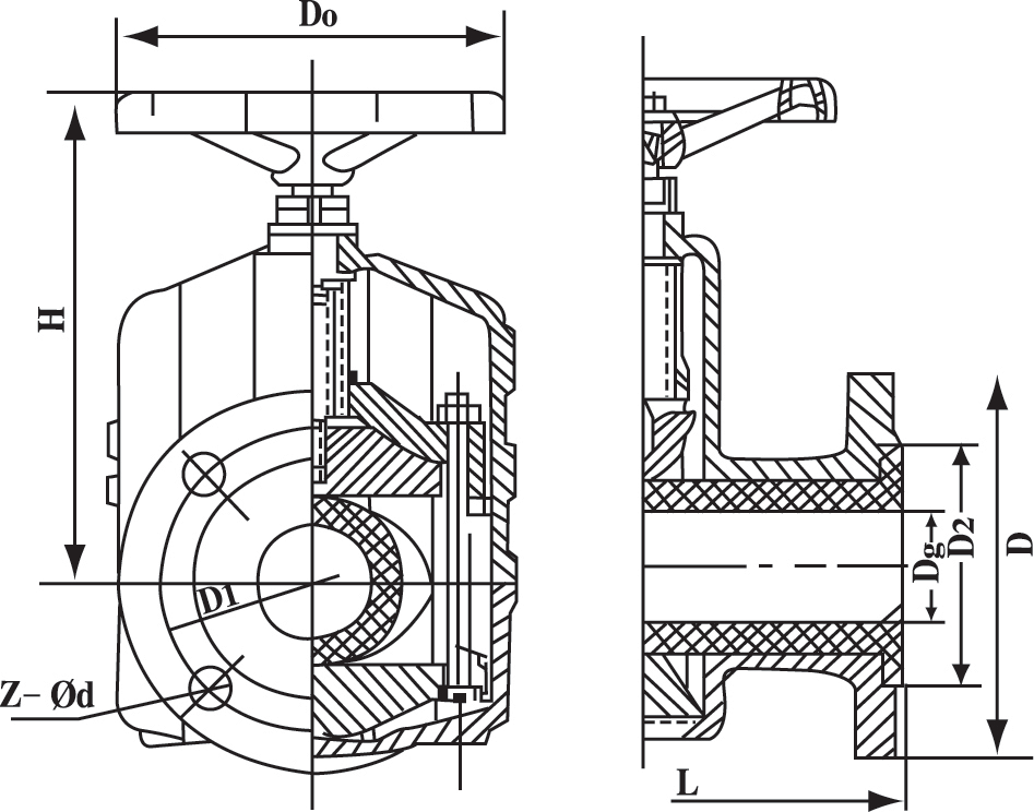 二、GJ41X型鑄鐵管夾閥結(jié)構(gòu)和工作原理: 1結(jié)構(gòu):本閥門由左右閥體,橡膠管套、大小閥桿、上下閘板、導(dǎo)柱等零件組成。 2工作原理:當(dāng)順轉(zhuǎn)手輪時(shí),使大小閥桿同時(shí)帶動(dòng)上下閘板,壓縮管套,進(jìn)行關(guān)閉,反轉(zhuǎn)即行開啟,這樣,閘板在導(dǎo)柱之間上下往復(fù)完成閥門開閉工作。另外,因橡膠管套承力,因此在開關(guān)時(shí),操作人員旋轉(zhuǎn)手輪時(shí)只要感到適量抵觸,均己達(dá)到開閉極點(diǎn),切勿盡力或多人輔助,禁用其他工具開閉。