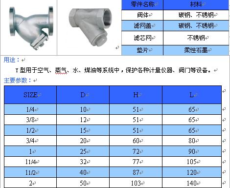 用途及特點Y型過濾器是輸送介質(zhì)的管道系統(tǒng)不可缺少的一種裝置,通常安裝在水力控制閥或其它設備的進口端,用來清除介質(zhì)中顆粒性雜質(zhì),以保護閥門設備的正常使用。Y型過濾器的過濾網(wǎng)采用不銹鋼雙層網(wǎng)結構,堅固耐用,具有結構先進、流阻小、排污方便等特點,可用于水、蒸氣、油品、硝酸、尿素、氧化性介質(zhì)等多種介質(zhì)。可根據(jù)用戶需要設置過濾網(wǎng)的目數(shù),一般通水網(wǎng)為18-30目,通氣網(wǎng)為40-100目,通油網(wǎng)為100-480目。連接形式法蘭式